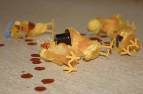 Selve mordet er enkelt utført for noen med litt trening i det. Kvintetten hadde ikke kommet lenger enn rett innenfor døra på herregården da de tok til å starte med generalprøven. Nummeret var en påminnelse om hvorfor vi feirer påske i Norge. Kyllingene piner* hverandre til døden, og står opp fra de døde 1. påskedag. Kylling Kvintetten begikk altså selvmord**