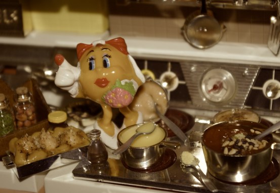 – På kjøkkenet. Det er et fantastisk kjøkken her. Et krydderskap så stort at det kan romme en liten mann! Har ikke sett noen da, men det er jo lov å håpe. Ms Pacman rødmet.