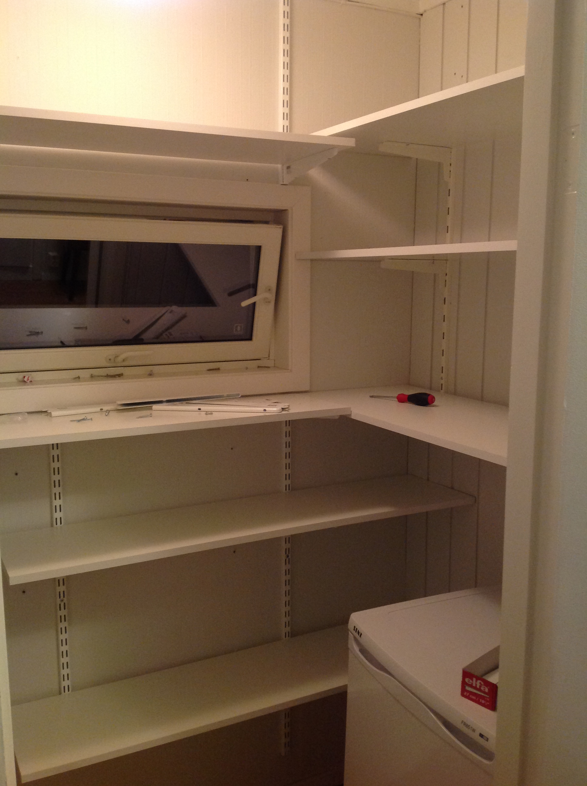 I dag har jeg vært skikkelig produktiv, på en annen måte enn til vanlig. Ingen dorullnisser, men hyller til Stens spiskammers. Det var jo hyller der fra før av, men etter en tur på Coop Obs Bygg Ski og noen timer med sag, skrujern, tommestokk og baufil har jeg mer enn doblet oppbevaringstilbudet til min bakeglade samboer. Lars nevnte at han skulle kjøpe lister i går og jeg kastet meg hjerteløst over ham og forlangte at han skulle ta meg med. Jeg har hatt lyst til å forbedre hyllene i flere rom en stund nå, og det er bedre å hoppe i det enn å krype. Siden jeg med dette som med doruller (og alt annet) jobber uten en altfor planlagt plan, for ikke å snakke om mitt rause antall tommeltotter, måtte jeg ty til kreativiteten både ofte og titt. Vi er godt fornøyde med resultatet og er spent på hvor mye vi får plass til, men det får vente til i morgen.