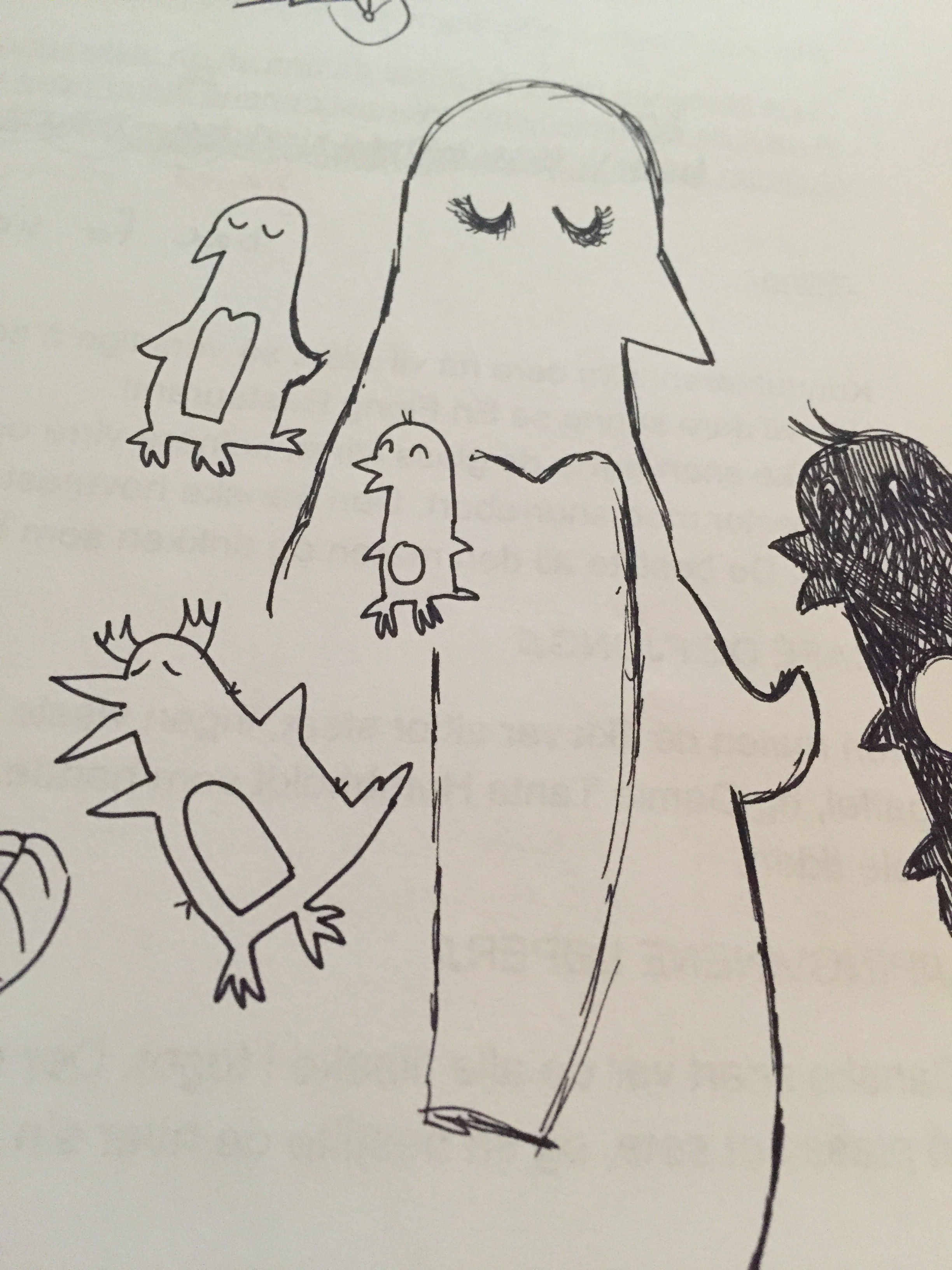 I dag fortsatte jobben med pingvinene på togtur. Jentene hadde jobbet mye med det siden i går, så det gikk som på skinner i dag (pun intended). Nå er vi snart klare til å besøke en skole nær deg. Så må jeg vel snart somle meg til å illustrere boken bak forestillingen også. Mellom slagene i dag rakk jeg å drodle litt, i et forsøk på å finne litt pingvindesign jeg kan trives med.
