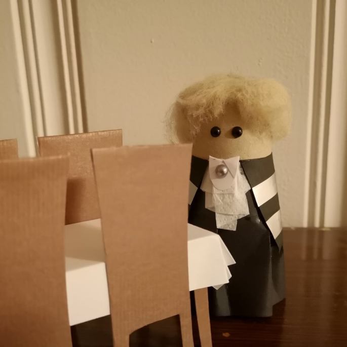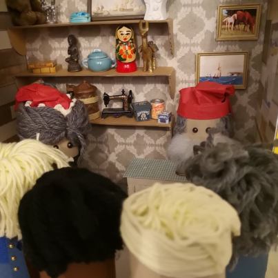 Bjella over døra plinget ubestemmelig østtysk-tsjekkoslovakisk, men allikevel veldig norsk, og inn kom en dame med et surt oppsyn, men en fantastisk hatt som sikkert også kunne være en paraply. Eller fallskjerm. Hun snakket med en mandig røst, og så etter en nøtteknekker for å få has på noen personlige problemer. Nissefar svarte at de hadde det ikke flere igjen av, og også han snakket med samme stemmen.